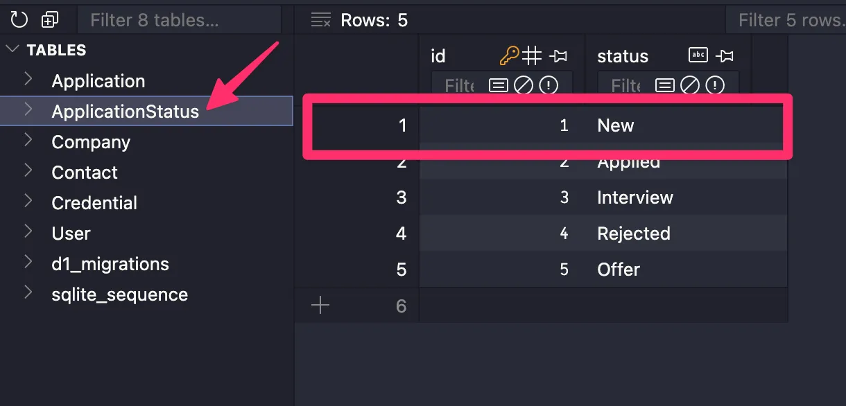 We want to do something similar for the status. If we look at the ApplicationStatus table, you’ll notice that an id of 1 is associated with a New application.